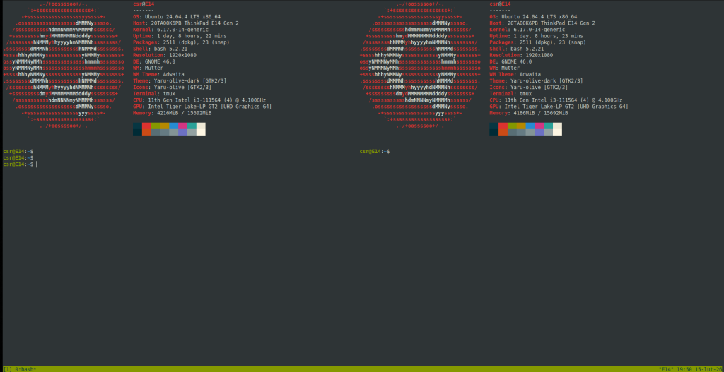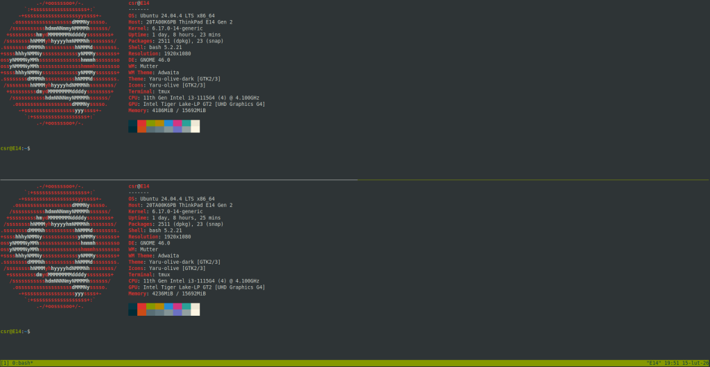 Tmux to aplikacja, która dzieli okno terminala na panele – zwane 'pane’. Wówczas nie musisz otwierać x terminali, wszystko masz w jednym oknie. Oczywiście minusem jest mniejszy obszar roboczy każdego panelu.